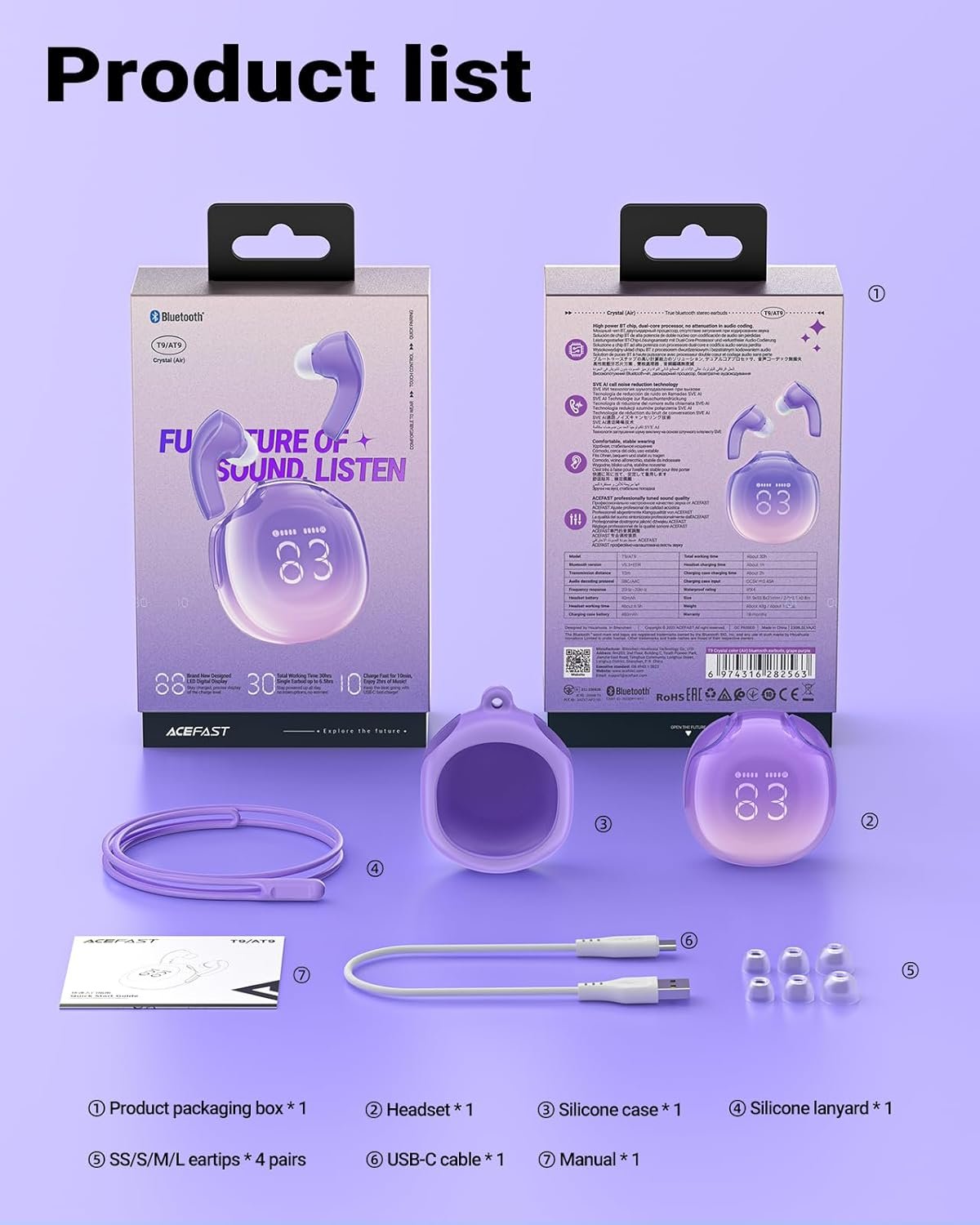 - [Ergonomic Design and Lightweight] ACEFAST T9 Bluetooth headphones comes with four different sizes of ear tips, our T9 are fit for most people’s ear canals. Our wireless Bluetooth headphones are small and light, single earbud is only 0.35oz, earbud size is 1.45*0.95*0.60in, charging case size is 2.01*2.25*0.95in, It’s more convenient to carry.