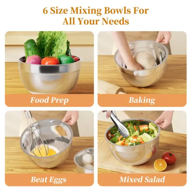 This bowl set is made of high quality, thick stainless steel that ensures safety and durability. No matter what you are mixing, grating, dough or baking, 6 sizes nesting mixing bowl stainless steel set for all your storage needs. It is kitchen essentials for new home!